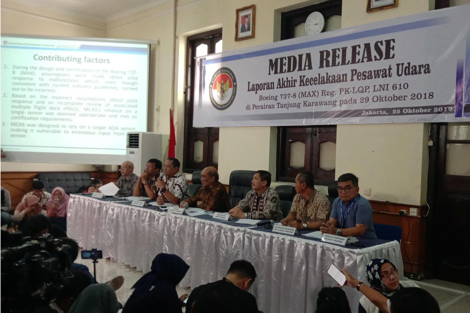Indonesian investigators speak during a news conference on Oct 25, 2019, in Jakarta, on the release of the final report on the 2018 crash of a Boeing 737 Max jet.