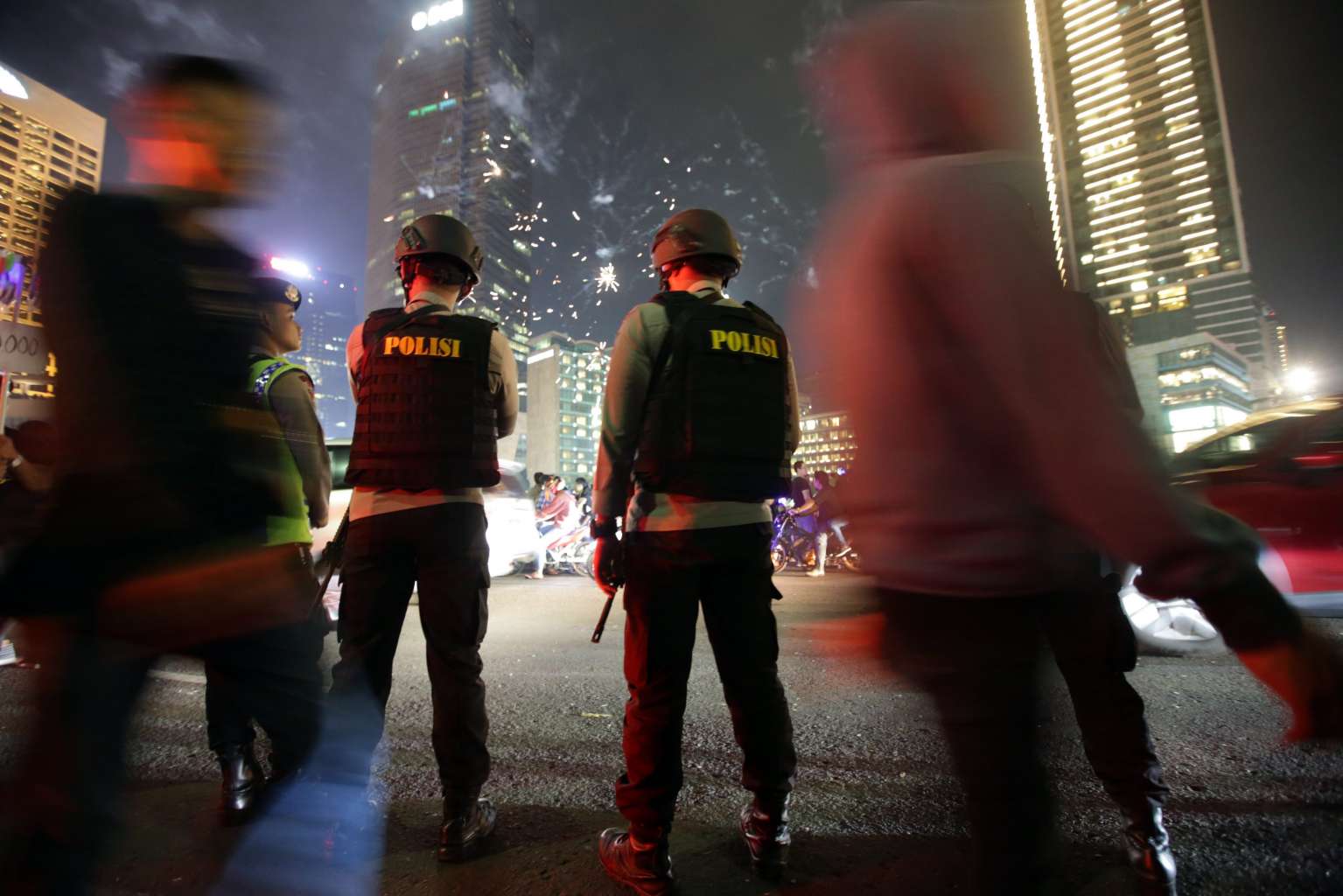 Indonesian Police officers stand guard during New Year's Eve celebrations in Jakarta.