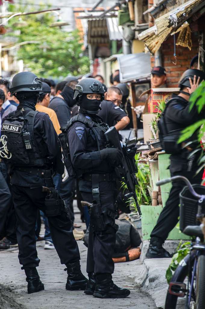 Indonesian anti-terror policemen from Densus 88 stand guard during a terror raid in Surabaya on June 8, 2016.