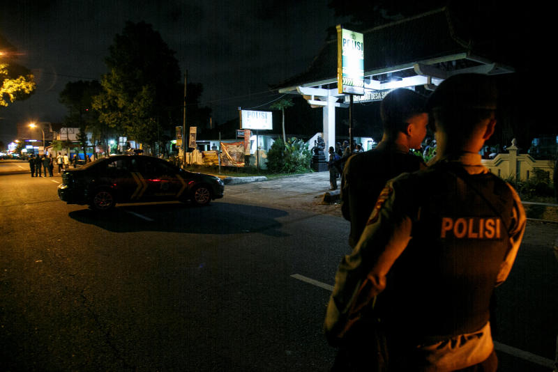 Indonesian police officers are seen standing guard near the scene of a shooting in Sleman, Yogyakarta, on July 14, 2018.
