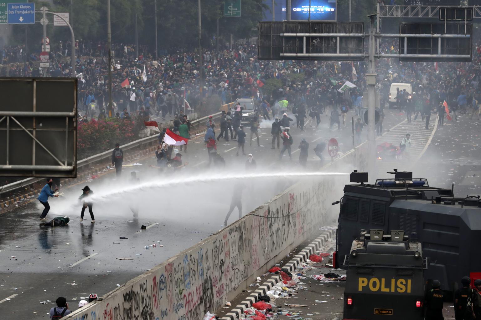 Indonesian riot police officers use a water cannon during clashes with students following a protest outside the Parliament building in Jakarta on Sept 24, 2019.