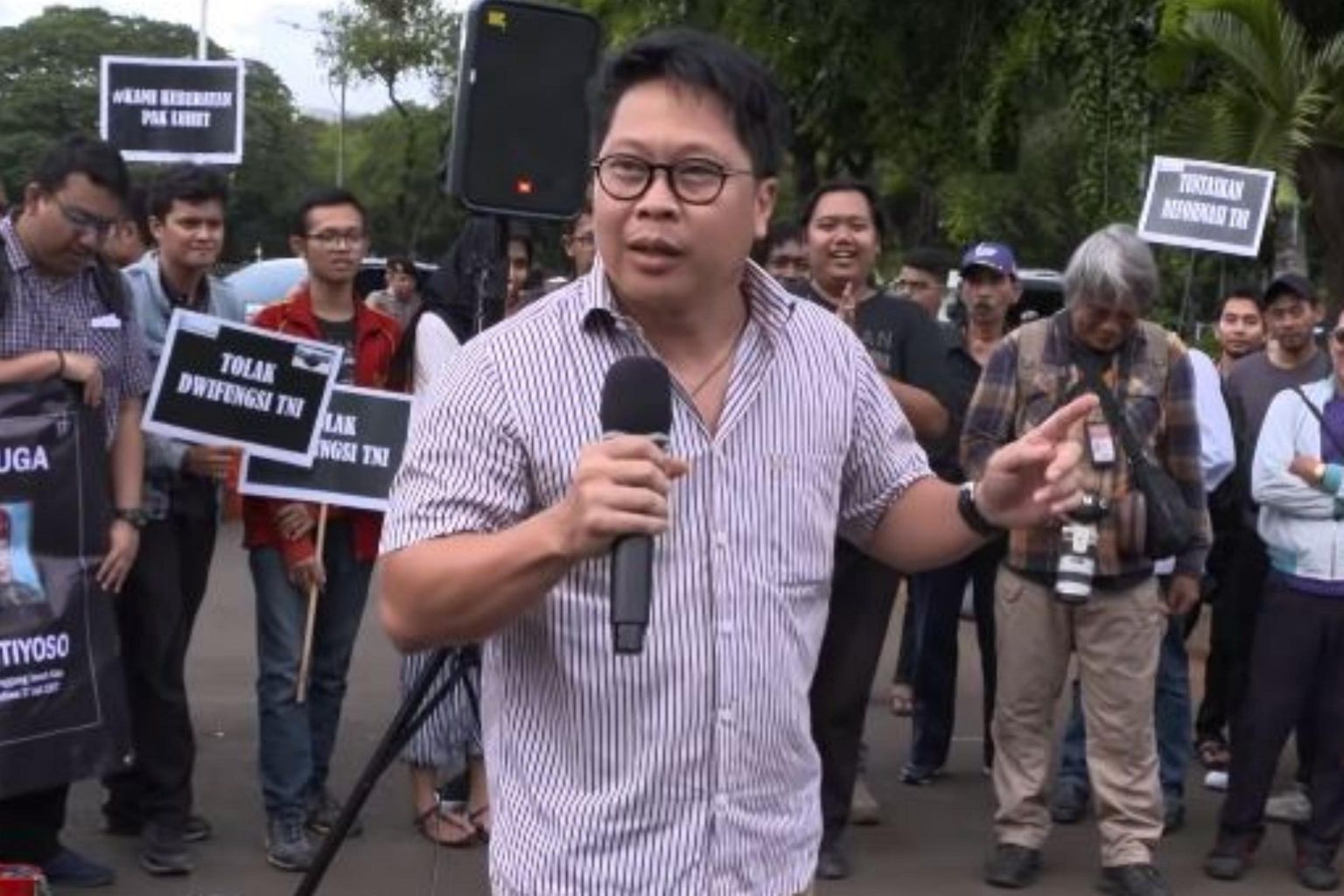 Amnesty International Indonesia board member Robertus Robet spoke against a plan by the government to allow senior military officers to hold civilian positions in government institutions in a rally last week.