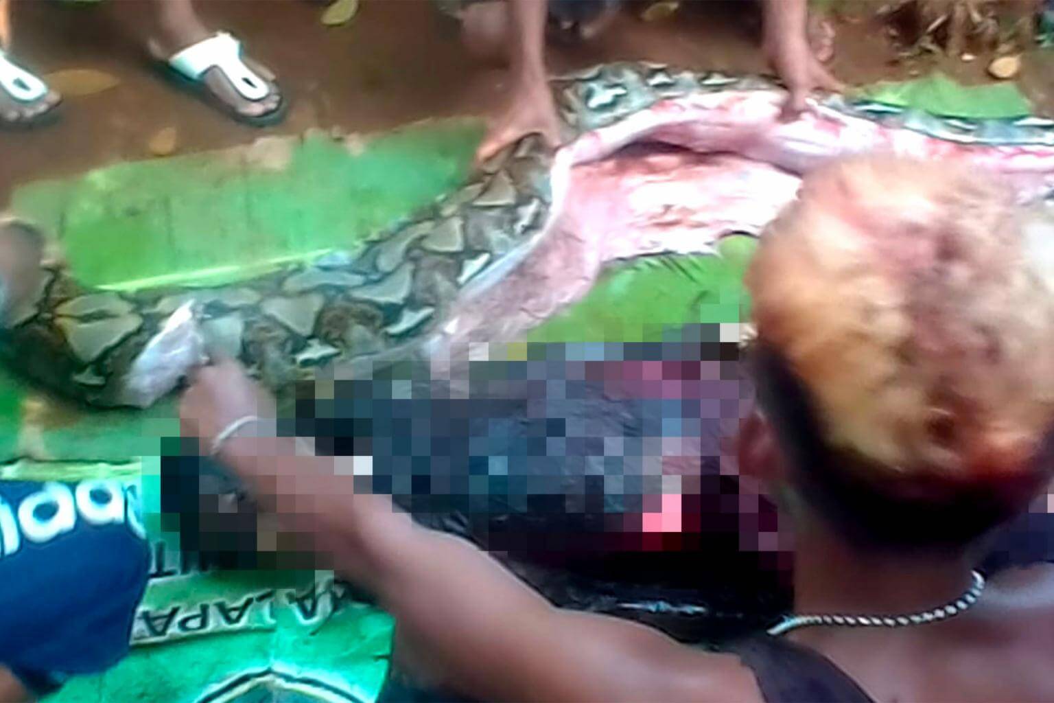 The body of Wa Tiba (bottom) lies next to a python after villagers cut open the snake which was found bloated in the village of Persiapan Lawela on the island of Muna, offshore of Sulawesi, on June 16, 2018.