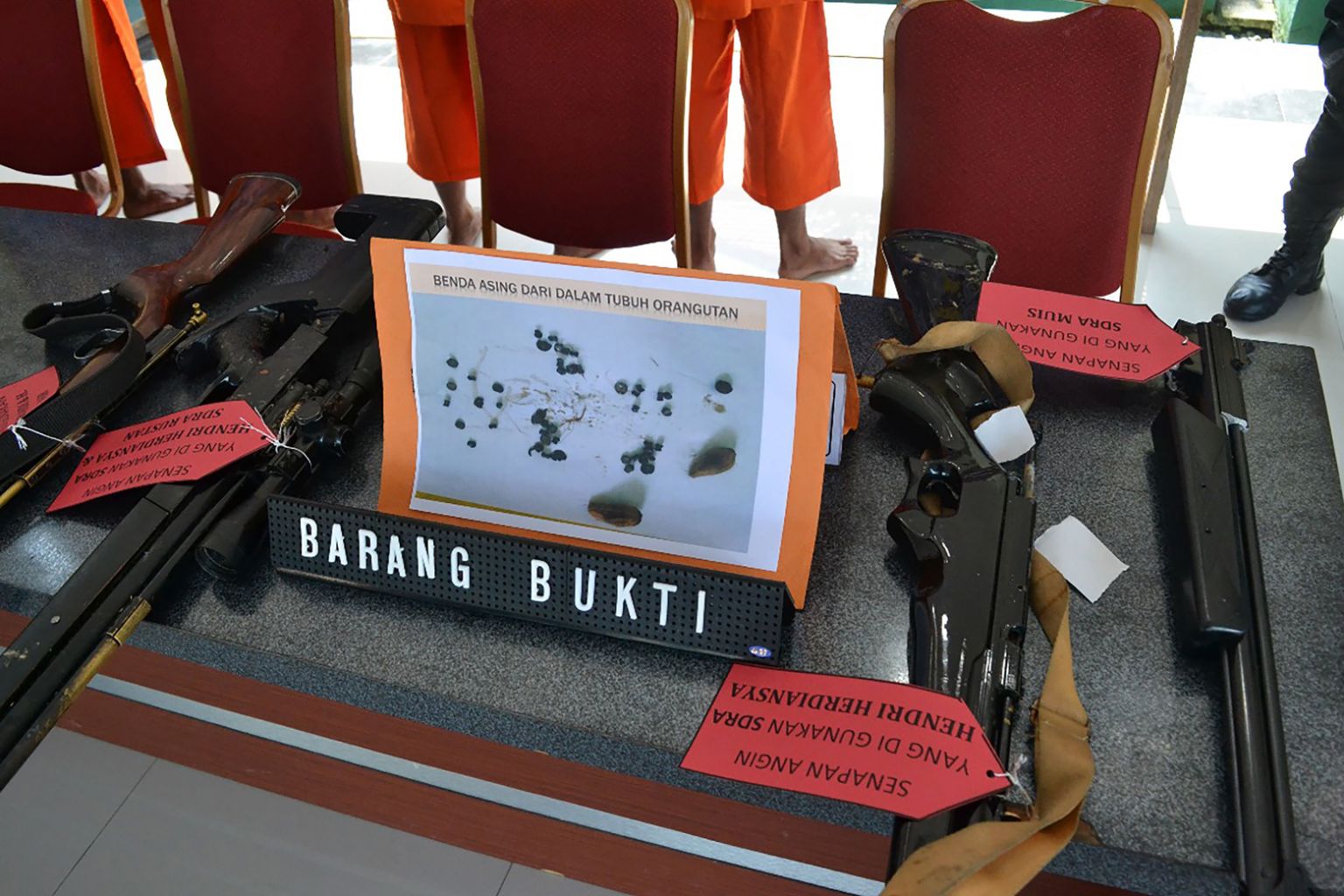 Police display evidence of weapons allegedly used by four Indonesian men while hunting and killing an orangutan in Kutai Timur on Feb 19, 2018.