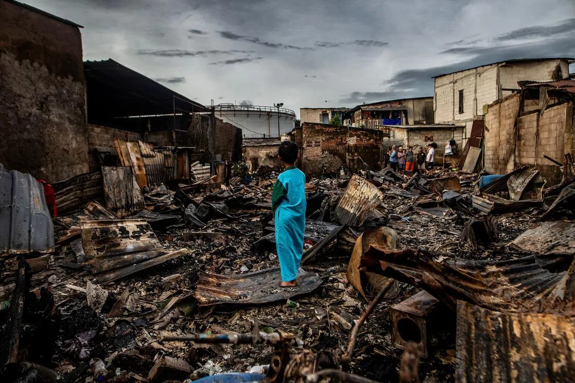 A boy standing in the remains of a burnt house in a residential area in Plumpang, north Jakarta, on March 4, 2023, after a fire at a nearby state-run fuel storage depot.