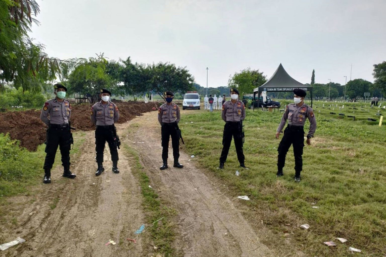 In Jakarta's two virus cemeteries, 30 personnel - including some wearing head-to-toe protective gear -would keep watch over interments and cemetery entrances, while others would ensure body-filled ambulances were not blocked, Mr Ngajib said.