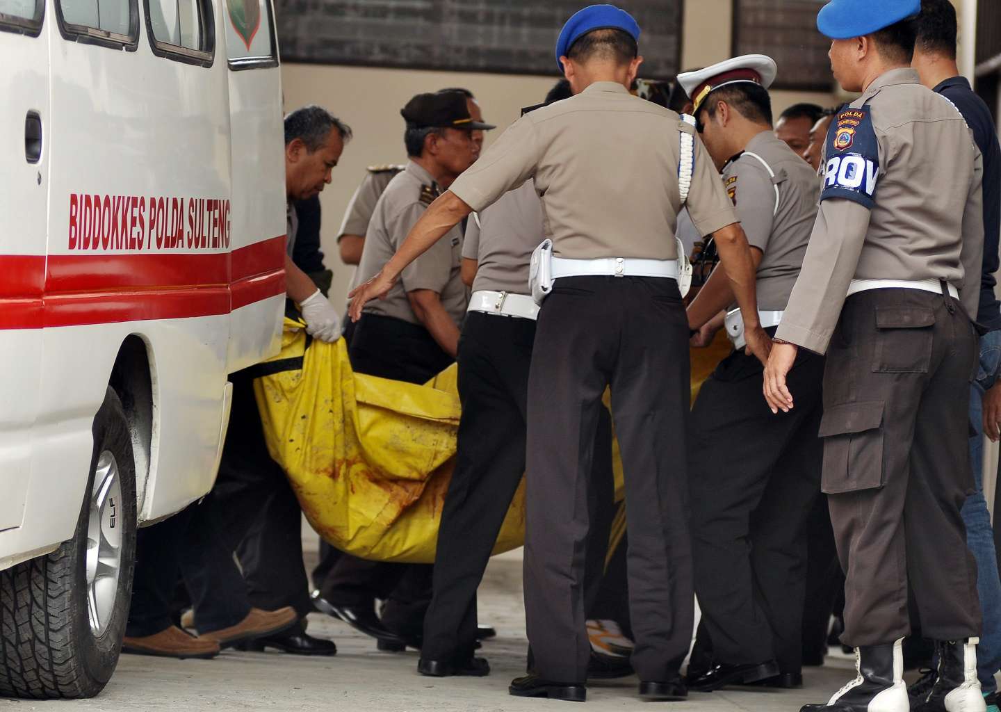 Indonesian police officers carrying body bags containing the body of two members of the East Indonesia Mujahidin (MIT) at a police hospital in Palu, Central Sulawesi, on July 19, 2016.