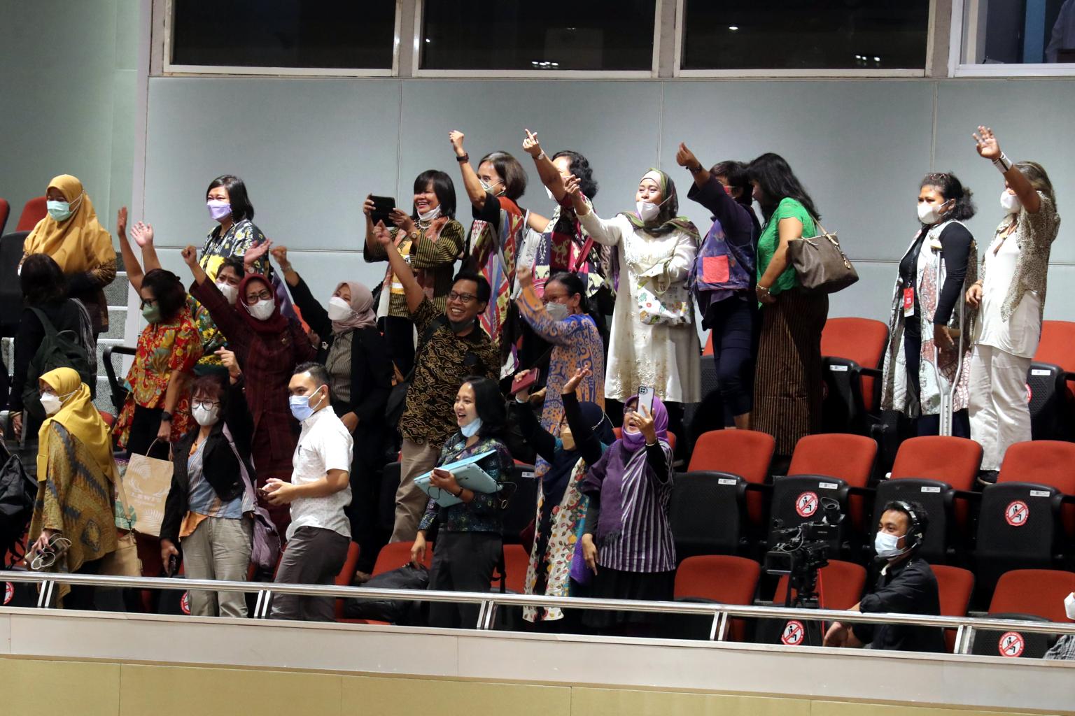 Activists celebrate after Indonesia's Parliament passed a Bill to tackle sexual violence, in Jakarta on April 12, 2022.