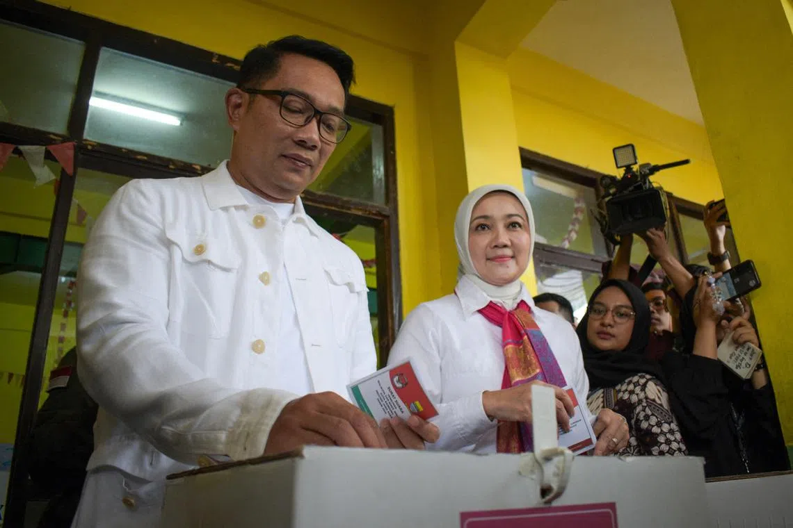 Mr Ridwan Kamil (left), a candidate for Jakarta governor, accompanied by his spouse Atalia Praratya, casting his ballot into a box at a polling station.