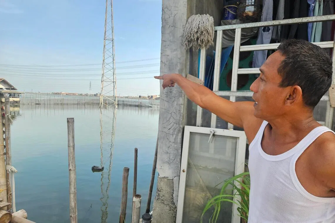 Mr Sutrisno Nurman pointing to the seawall that he blames for affecting his milkfish farm, which requires brackish water.