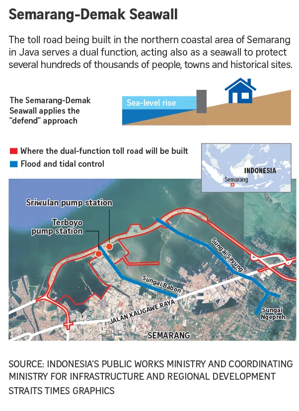 In Semarang-Demak, the approach is to set up fortress-like barriers, Mr Rachmat said. But in other areas that are not as densely populated, the government will adopt a retreat strategy, involving moving the population farther inland and planting mangroves to serve as a natural defence against the rising tide. Yet another way might be to rely on a system of hilly dikes to keep certain areas dry, he added.