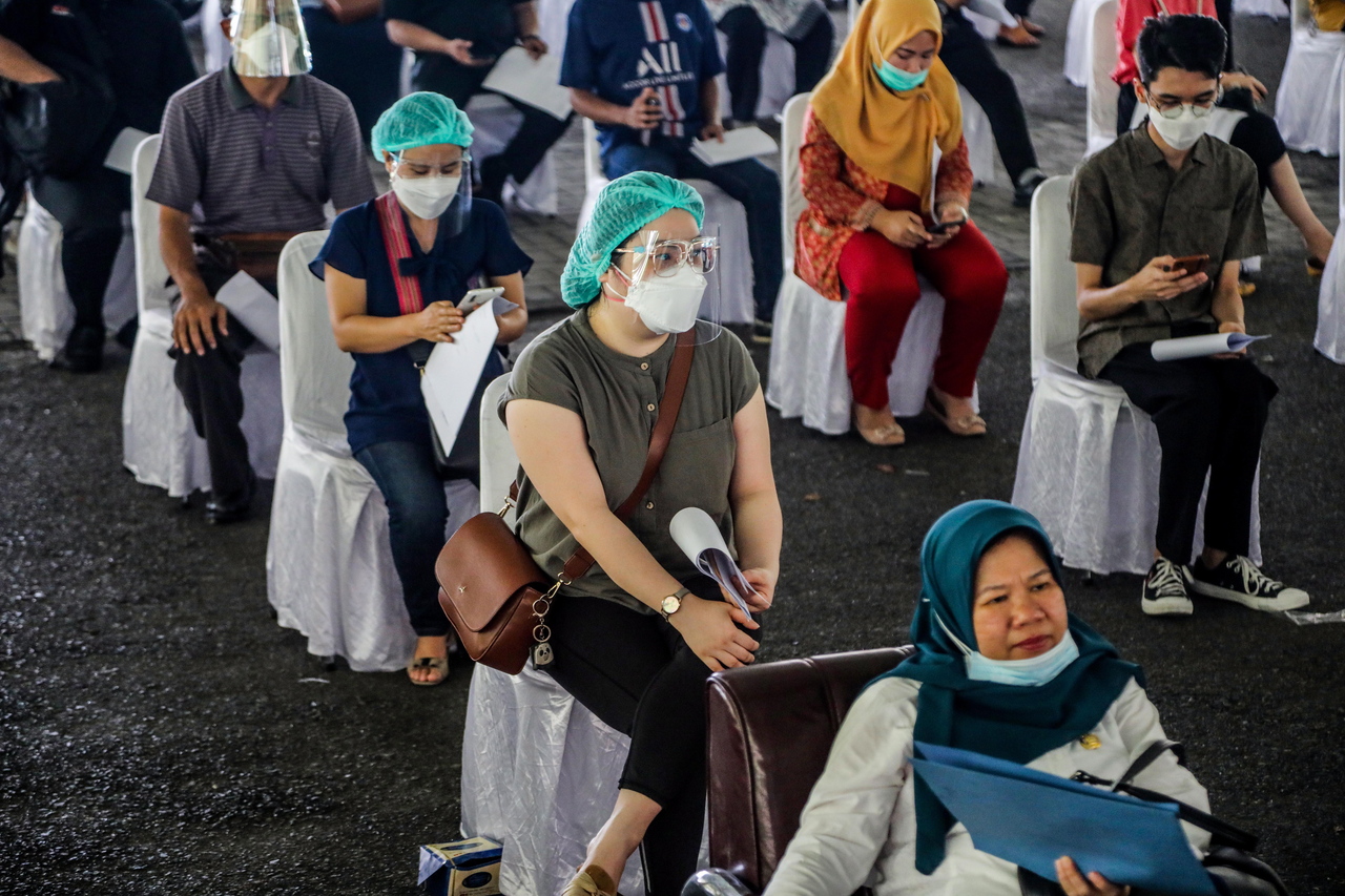 Healthcare workers wait during a mass vaccination drive in Medan, on Feb 10, 2021.