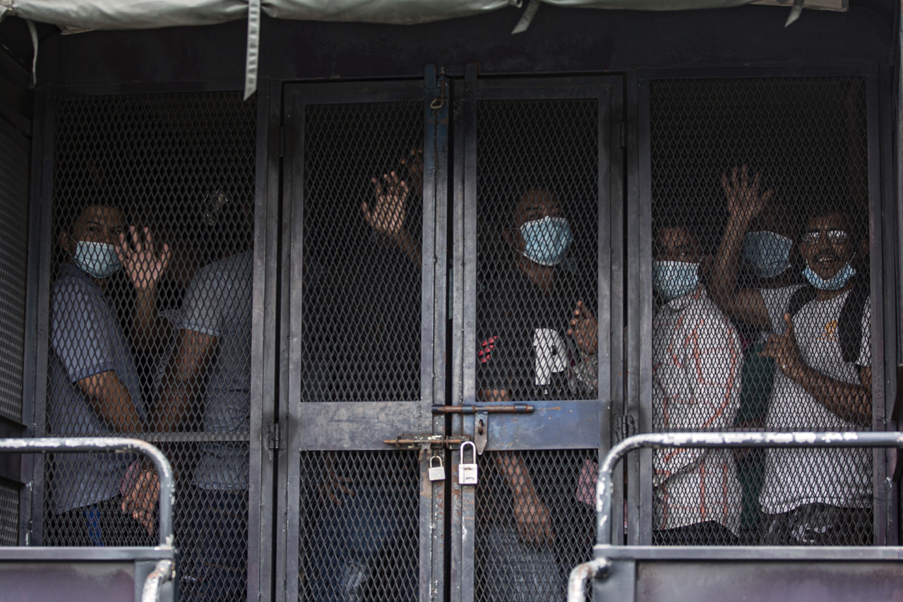 Migrant workers are transferred to a detention center after a raid in Petaling Jaya, Malaysia, on May 20, 2020.