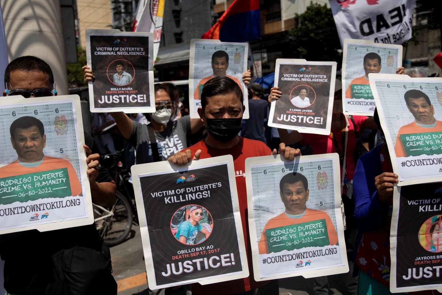 Protesters hold photographs of alleged victims of extra-judicial killings and mock mugshots of President Rodrigo Duterte, during a protest to mark Duterte's final year in office, in Manila, in June 2021.