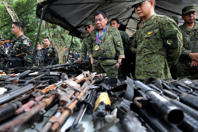 Philippine President Rodrigo Duterte inspects firearms together with Eduardo Ano, Chief of Staff of the Armed Forces of the Philippines, during his visit at the military camp in Marawi city, southern Philippines on July 20, 2017.