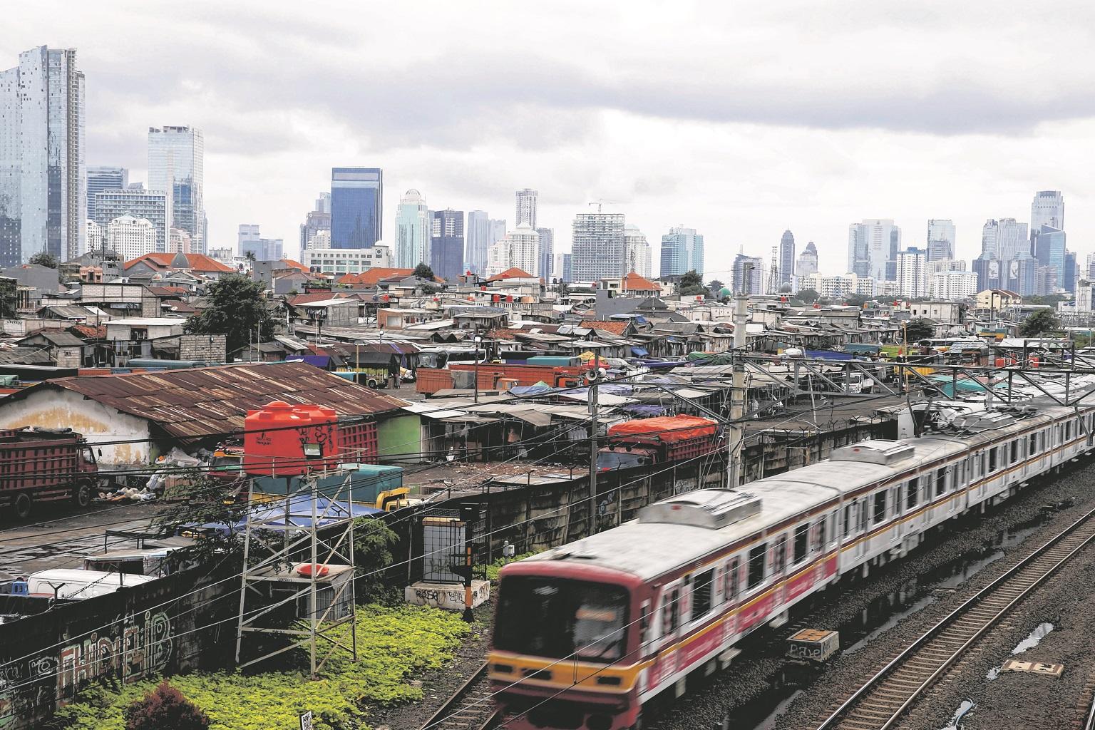 A commuter train seen against the backdrop of high-rise buildings at the Tanah Abang district in Jakarta, Indonesia, on Jan 19, 2018.