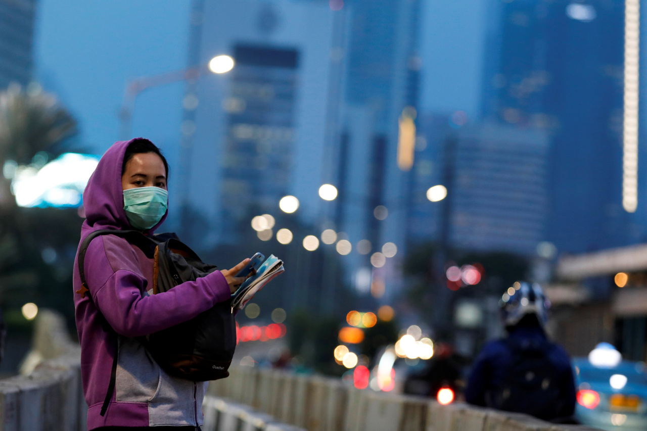 A woman wearing a protective face mask stands on the sidewalk amid the coronavirus outbreak in Jakarta, Indonesia, on March 19, 2020.
