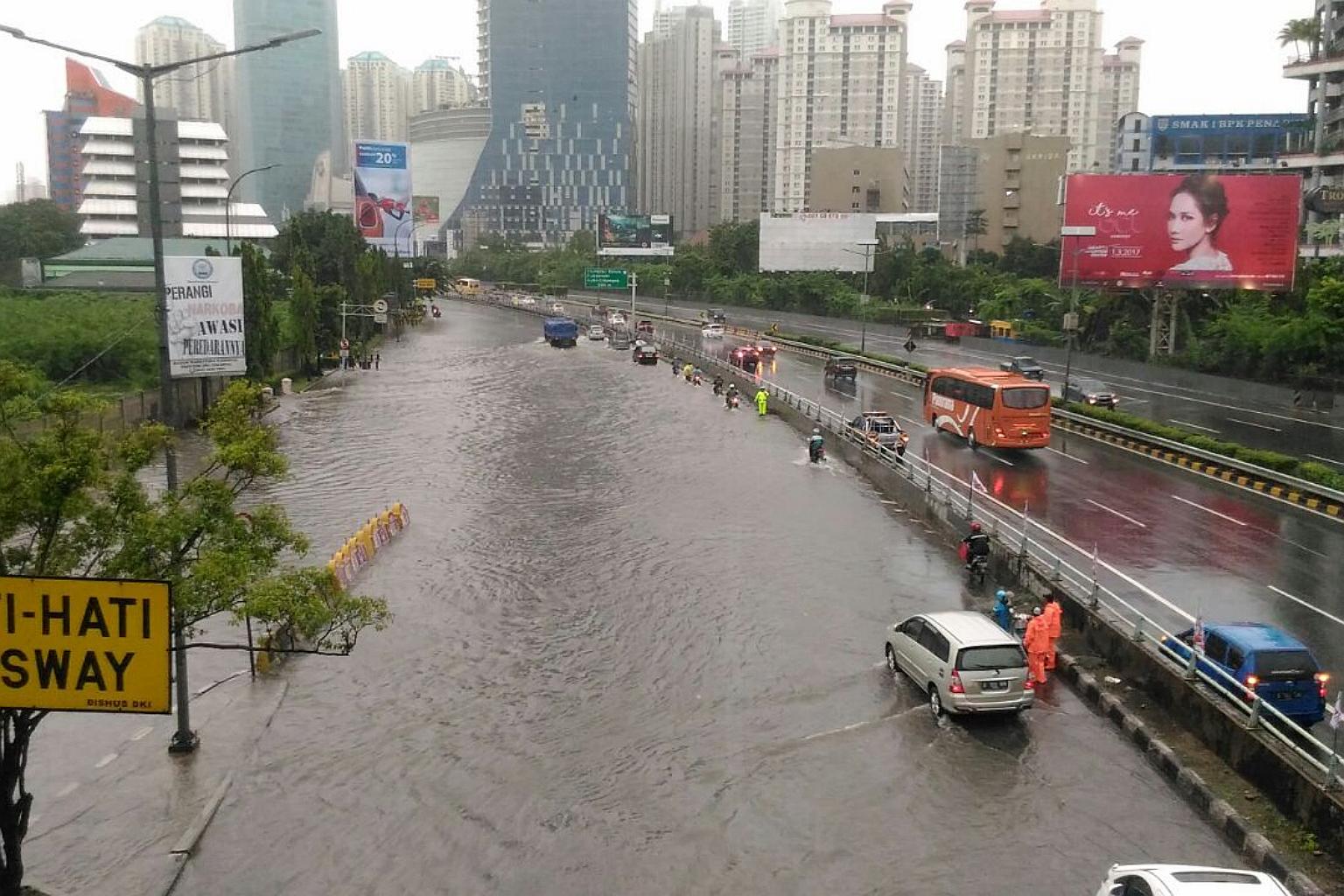 Flood along a highway in Jakarta on Tuesday, Feb 21, 2017.