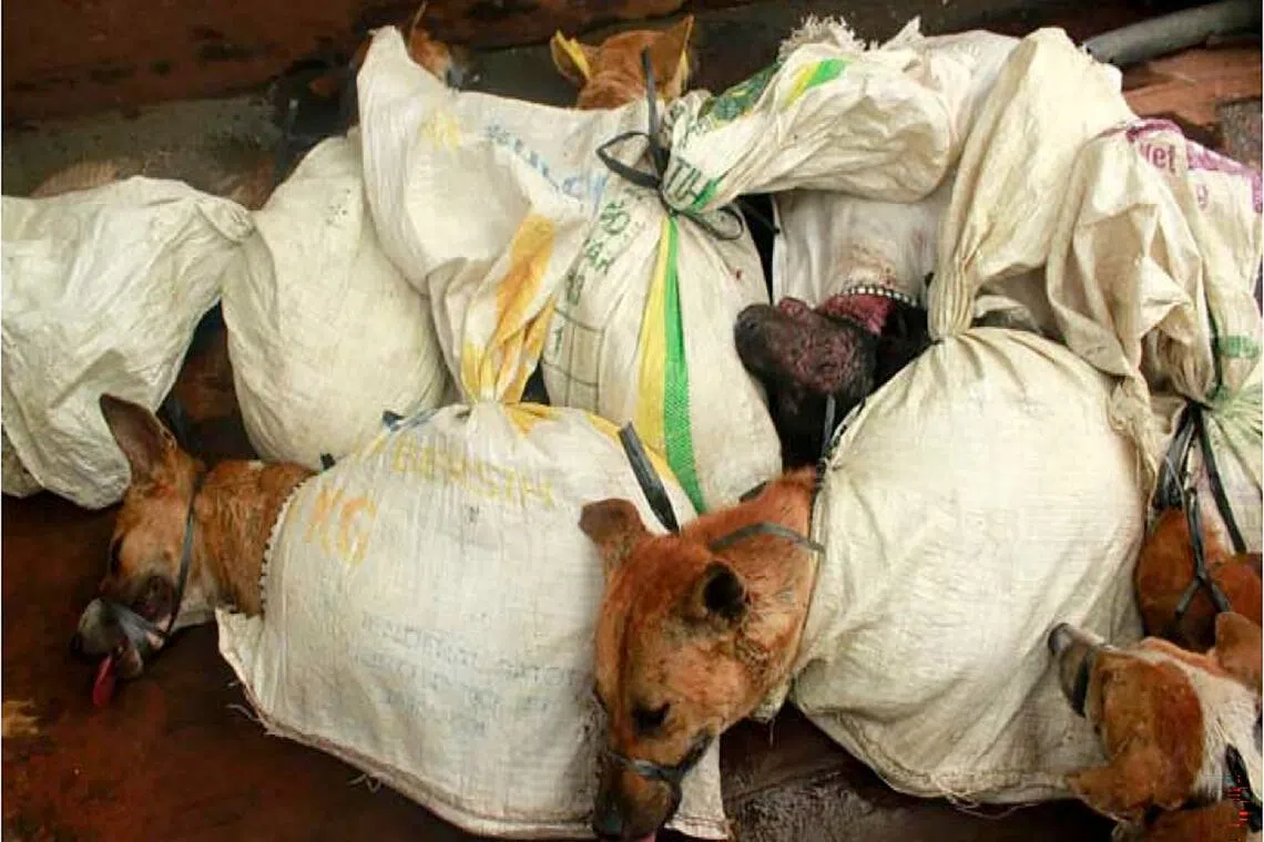 Captured dogs awaiting slaughter are bound in sacks.