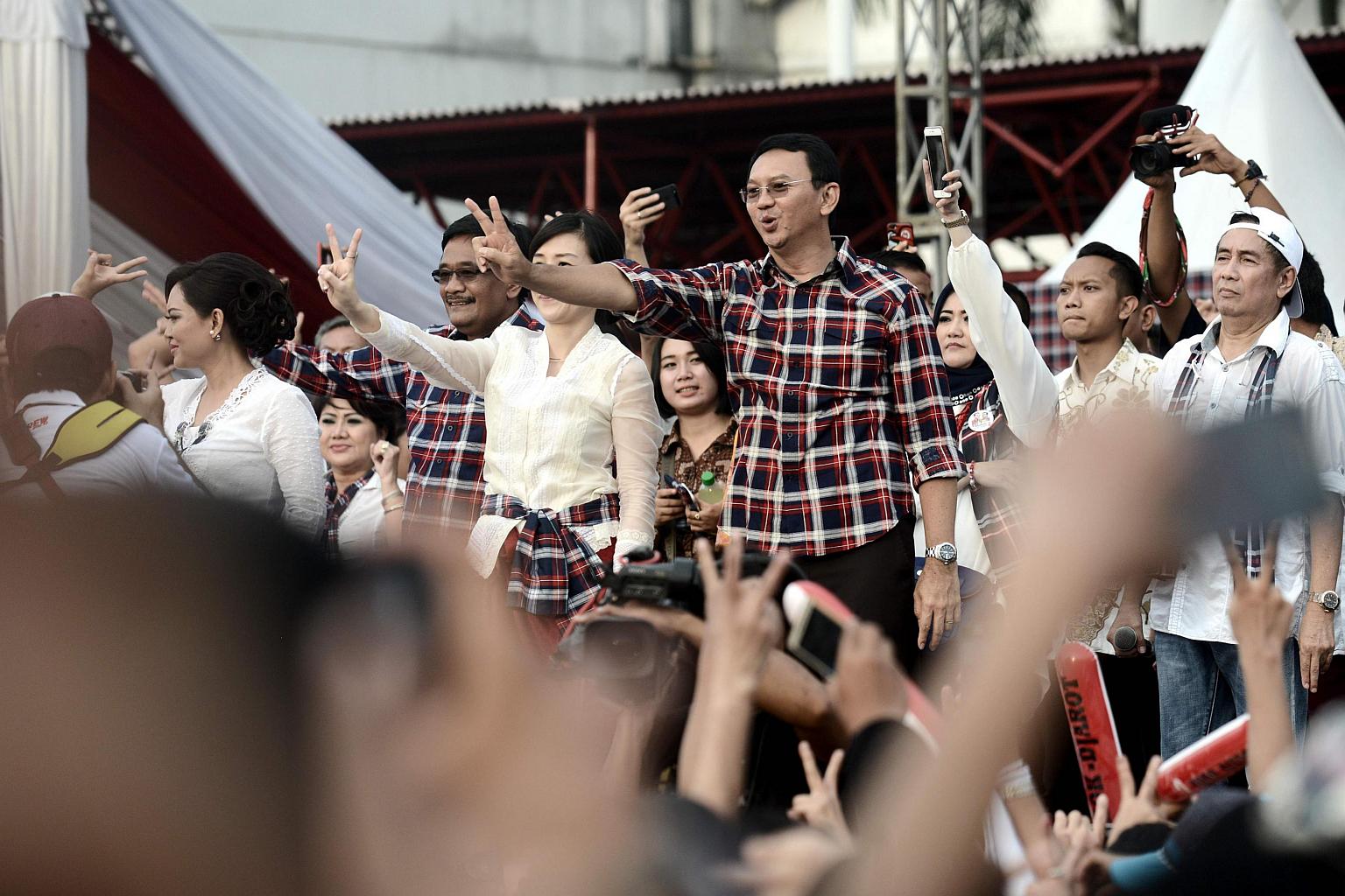 Chinese Christian governor Basuki Tjahaja Purnama (centre) gestures to his supporters at his final campaign rally prior to the gubernatorial election in Jakarta.