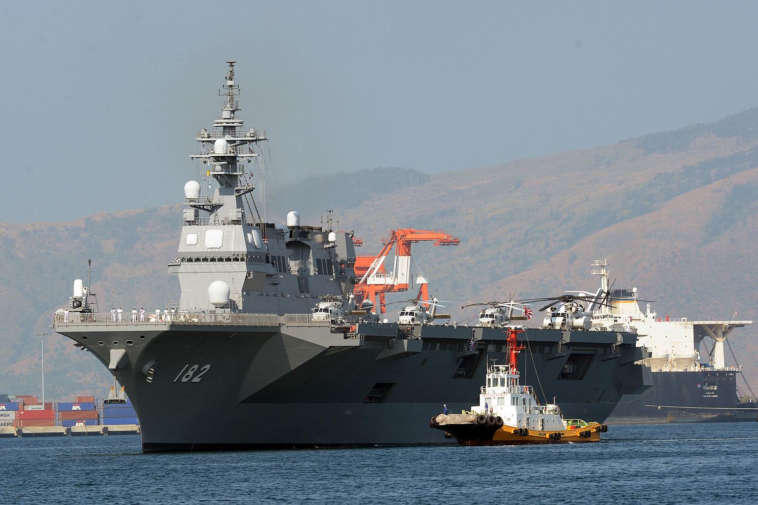 Japanese helicopter carrier Ise is towed as it prepares to dock at the former US naval base, Subic port, north of Manila on April 26, 2016.