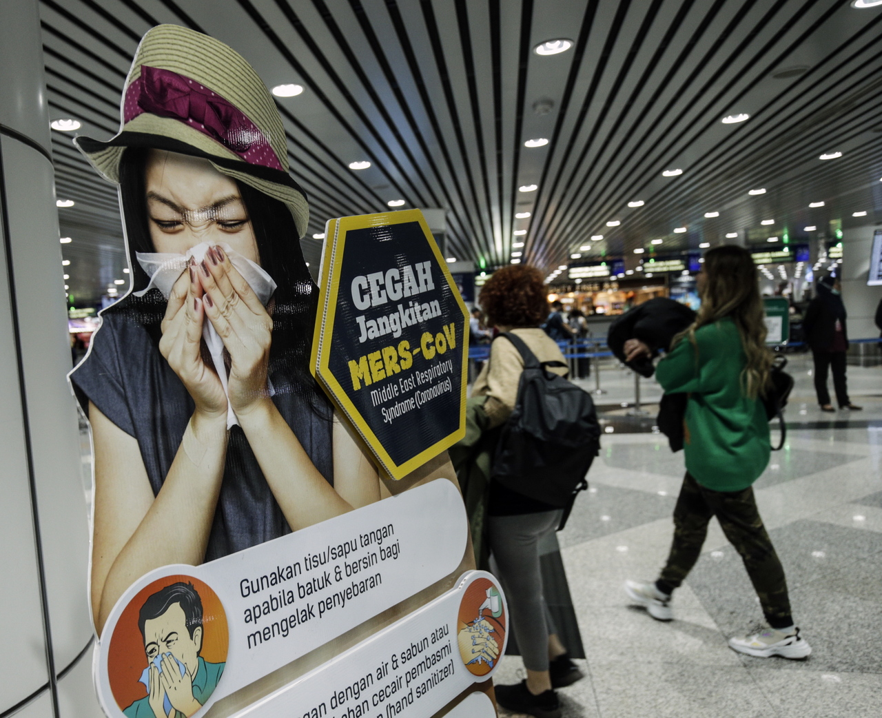 Passengers walk past a poster about a coronavirus screening upon their arrival at the Kuala Lumpur International Airport in Sepang, on Jan 21, 2020.