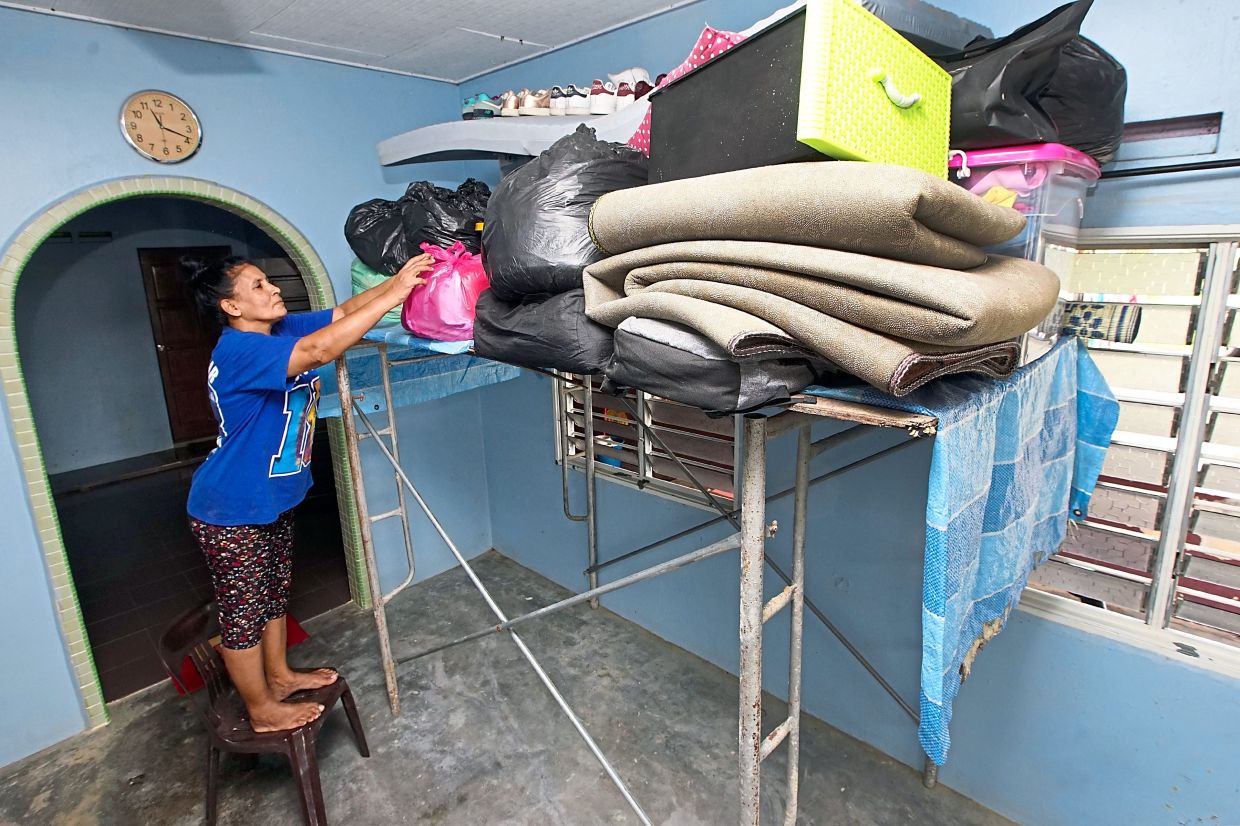 Skudai resident Sharifa Mohd Safi placing her household items on top of scaffolding in her house.