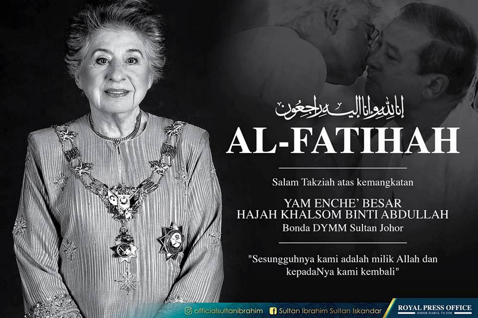 JOHOR BARU (THE STAR/ASIA NEWS NETWORK) - Johor's Sultan Ibrahim Ibni Almarhum Sultan Iskandar's mother Enche' Besar Hajah Khalsom Abdullah died in London on Friday (June 1). She was 83.