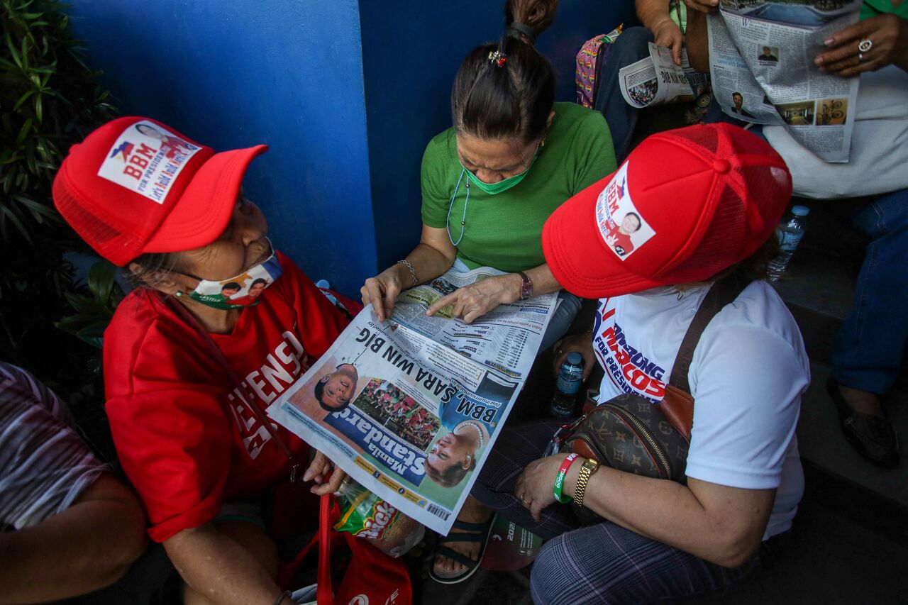 People read a newspaper with coverage of Ferdinand Marcos Jr's presidential victory in Metro Manila on May 10, 2022.