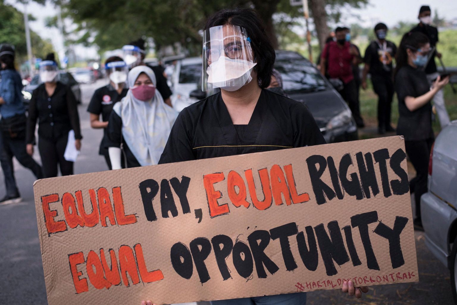 A contract doctor holds a placard during a strike outside the Sungai Buloh Hospital in Selangor state on July 26, 2021.