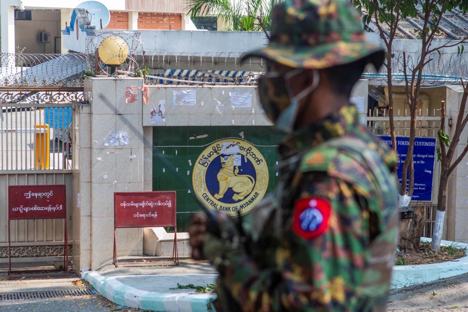 A soldier outside Myanmar's Central Bank during a protest against the military coup, in Yangon, Myanmar, on Feb 15, 2021.
