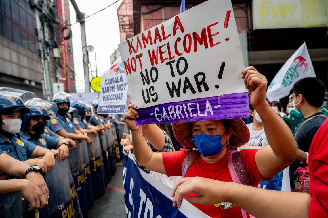 People during a protest in Manila against US V-P Kamala Harris’ visit to the Philippines, on Nov 21, 2022.