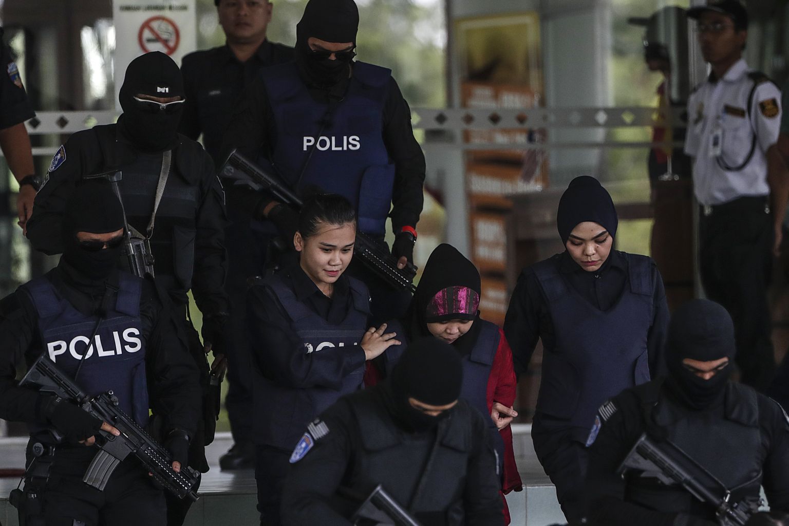 Indonesian Siti Aisyah, who is detained in connection with the death of Kim Jong Nam, is escorted by Malaysian police officers as they leave the Shah Alam High Court on Jan 22.
