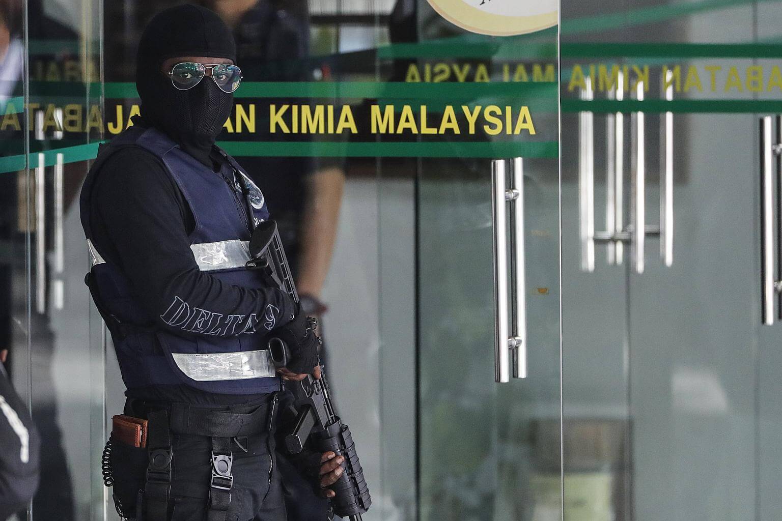 A Royal Malaysia Police officer stands guard at the Malaysia Chemistry Department in Petaling Jaya, Malaysia, on Oct 9, 2017.