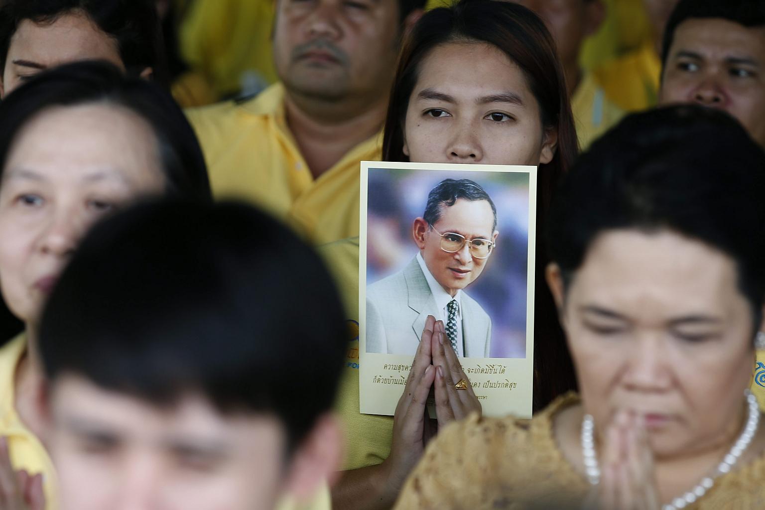 Thai people holding pictures of Thai King Bhumibol Adulyadej as they pray on June 9, 2016, during the celebrations of the monarch's 70th anniversary of accession to the throne.