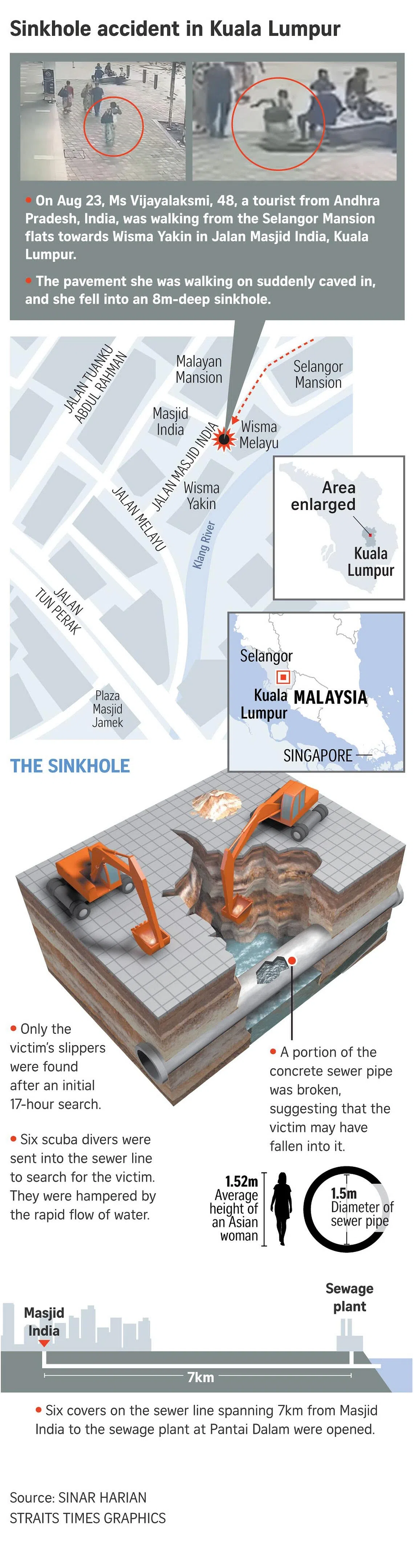 A homeless man, who witnessed Ms Vijayalaksmi falling into the sinkhole, spoke of how he had cheated death when the ground collapsed as he was among those seated on a concrete bench next to the sinkhole. He said his body was partially inside the hole but he managed to pull himself up.
