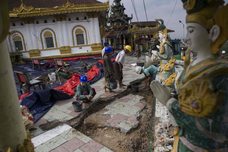 Workers repairing the grounds of the hilltop Kyeik Than Lan pagoda, which has been damaged by a landslide caused by flooding in southern Myanmar, on June 18, 2018.