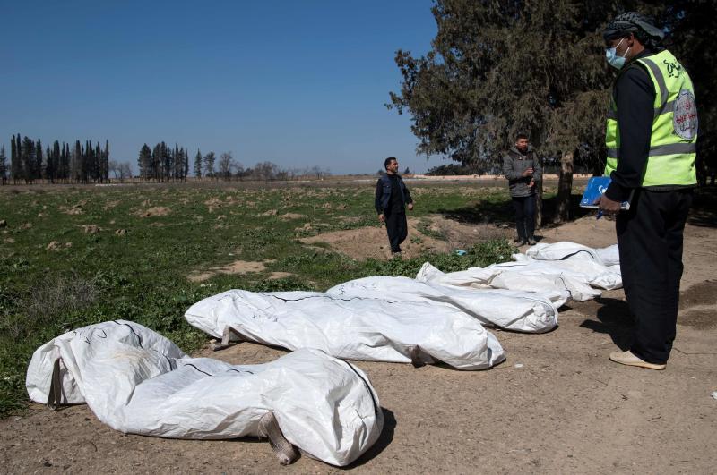 First responders learned of the burial site in the Al-Fukheikha agricultural suburb last month, more than a year after US-backed forces captured Raqqa from the Islamic State in Iraq and Syria (ISIS) and as they closed in on the group's final redoubt of Baghouz further south.