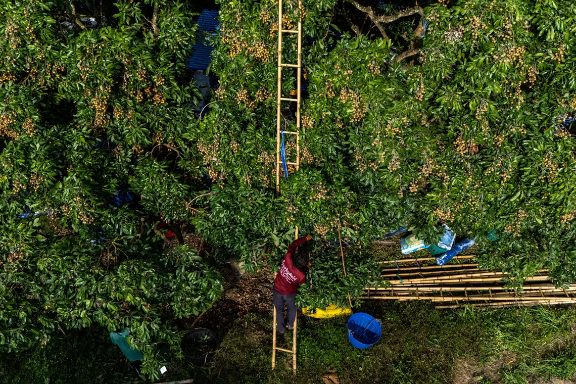 PONG NAM RON, Thailand - Mr Tun Min Lat climbs a bamboo ladder in the longan orchards of eastern Thailand, moving from tree to tree as he plucks the juicy tropical fruit in the sweltering heat of a November morning.