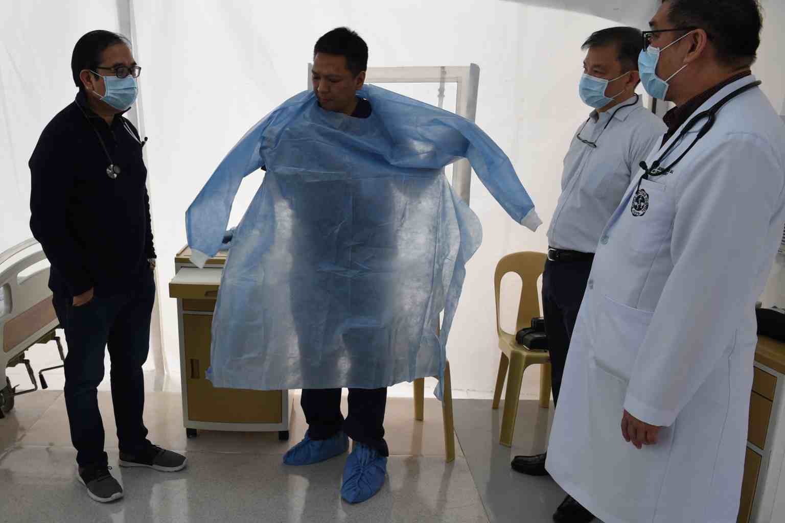 Hospital officials on Jan 31, 2020, watching a medical worker demonstrate the best way to put on protective gear inside the holding area for patients suspected of being infected with the Covid-19 coronavirus at the Manila Doctors Hospital.