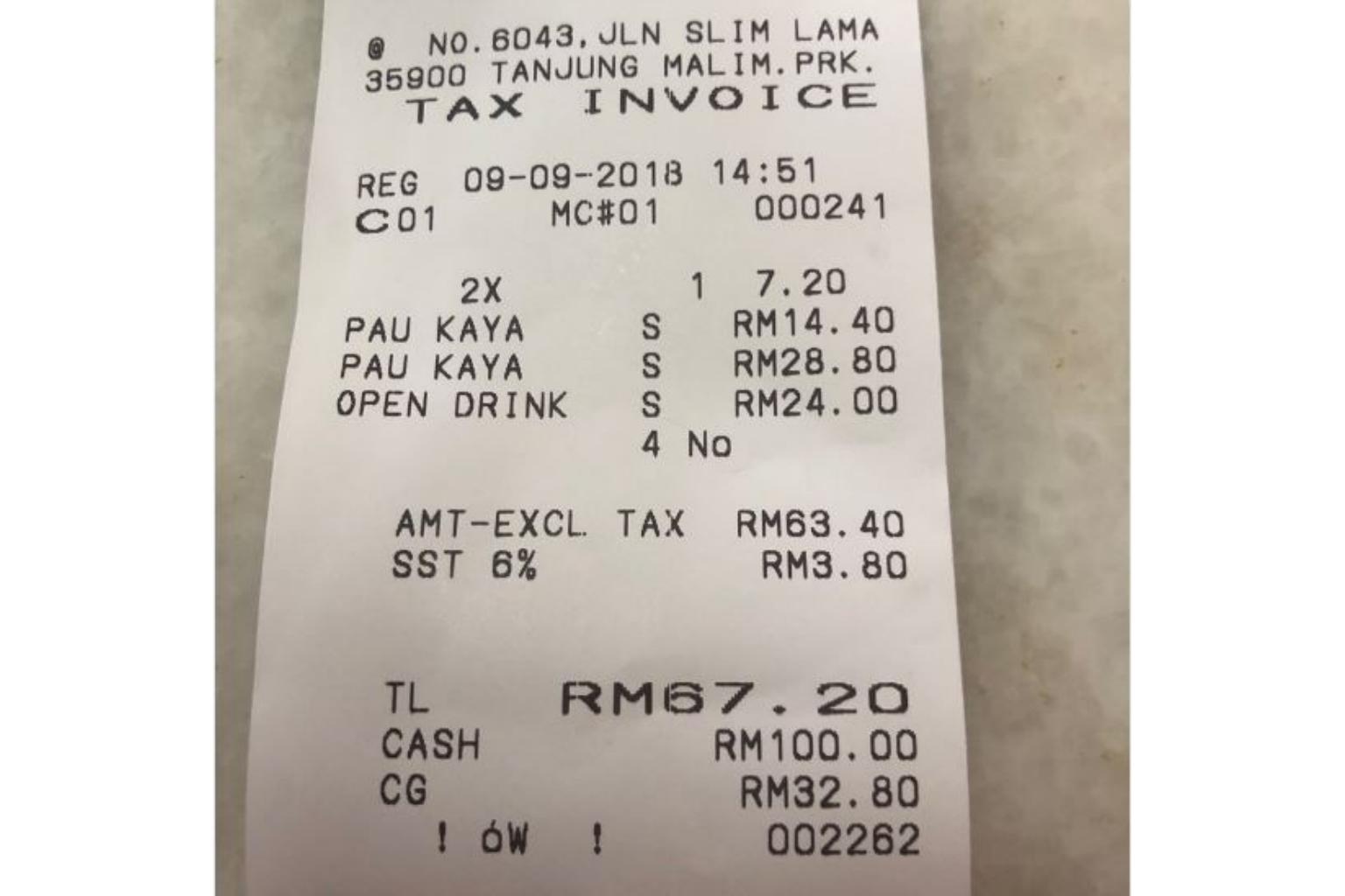 Najib, in a post on his Twitter account on Sunday (Sept 9), lamented that the "kuih pau" or steamed buns he bought were charged SST and he also uploaded the receipt he received from the restaurant which showed the SST amount of RM3.80 (S$1.30).