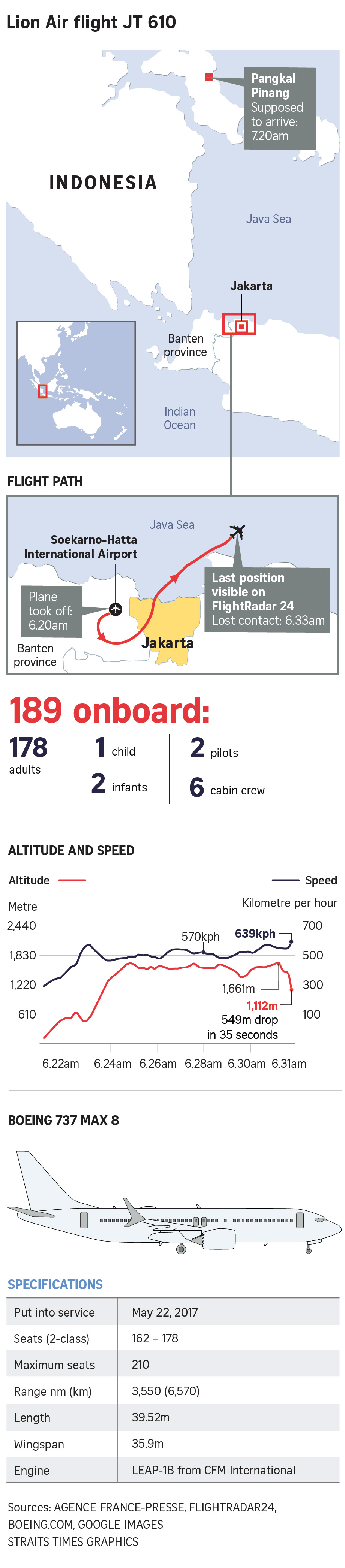 There were 189 people on board flight JT610 of budget airline Lion Air when ground staff lost contact with the Boeing 737 Max 8 aircraft early on Monday, 13 minutes after it left the airport in the capital, Jakarta.