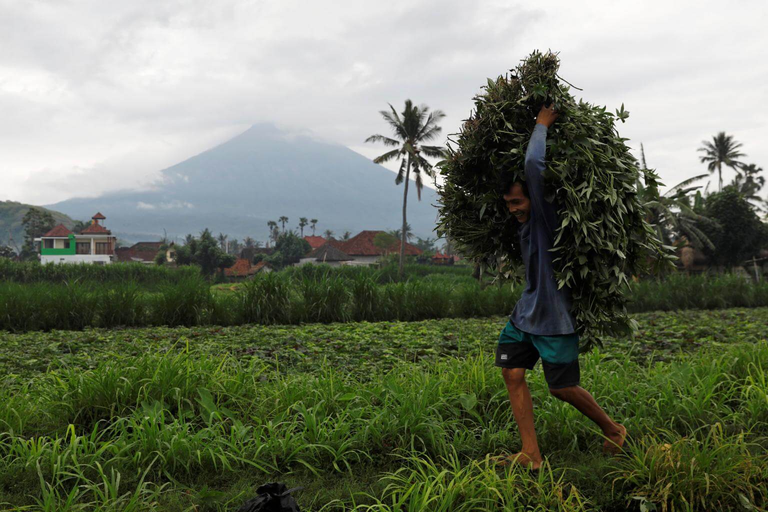 A farmer carries fresh crop from a field as Mount Agung volcano spews smoke and ash.