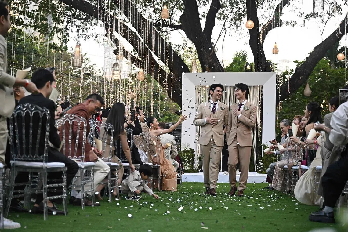 Actors Apiwat “Porsch” Apiwatsayree (left) and Sappanyoo “Arm” Panatkool at their unofficial wedding ceremony in Bangkok on Jan 10.
