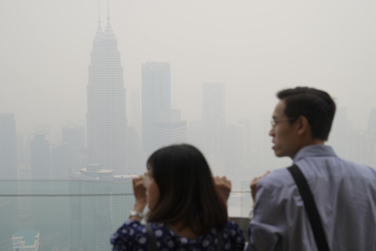Tourists look out from the Kuala Lumpur Tower during a hazy day in the Malaysian capital, on Sept 13, 2019.