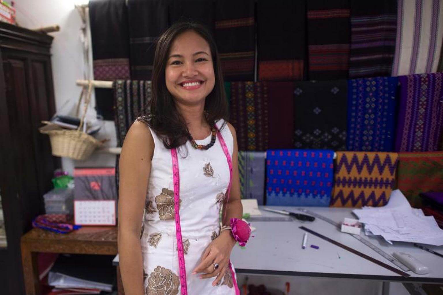 Her boutique in Yangon is filled with colourful designs in cotton and silks sourced from Chin and Shan states, where they can take months to weave by hand using traditional wooden looms.