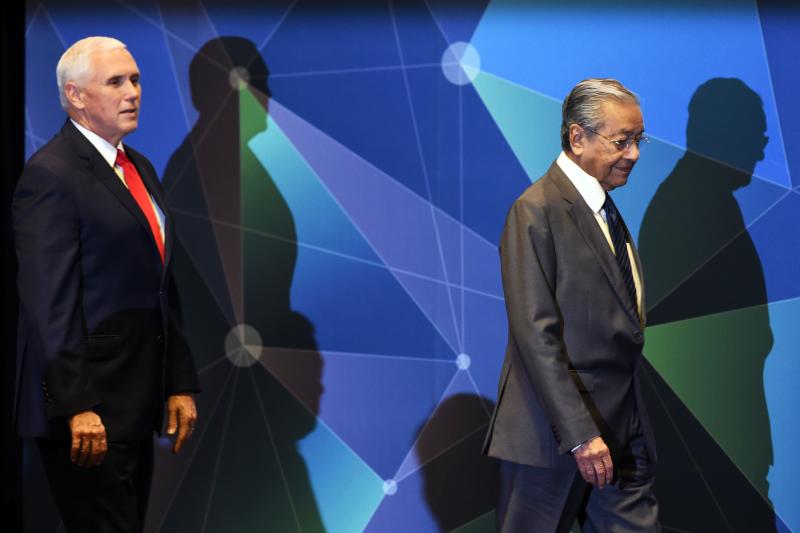 US Vice-President Mike Pence and Malaysian Prime Minister Mahathir Mohamad at the start of the Asean-US summit in Singapore on Nov 15, 2018.