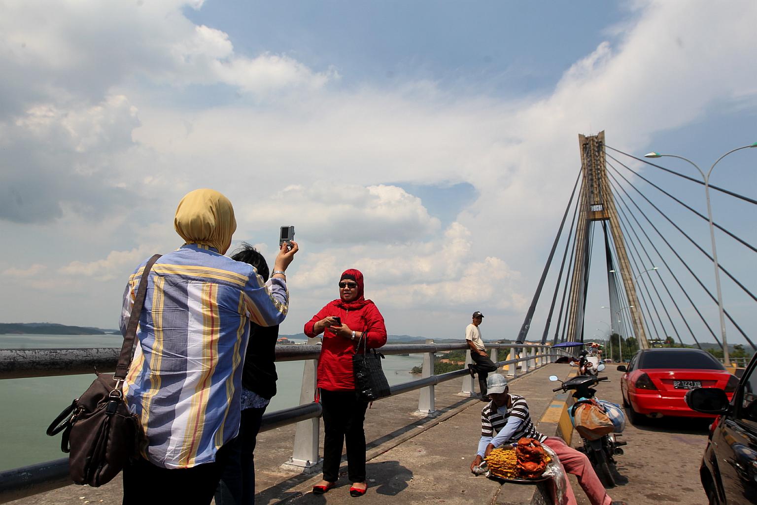 Tourists posing for photos at the Balerang main bridge in Batu Aji, Batam.