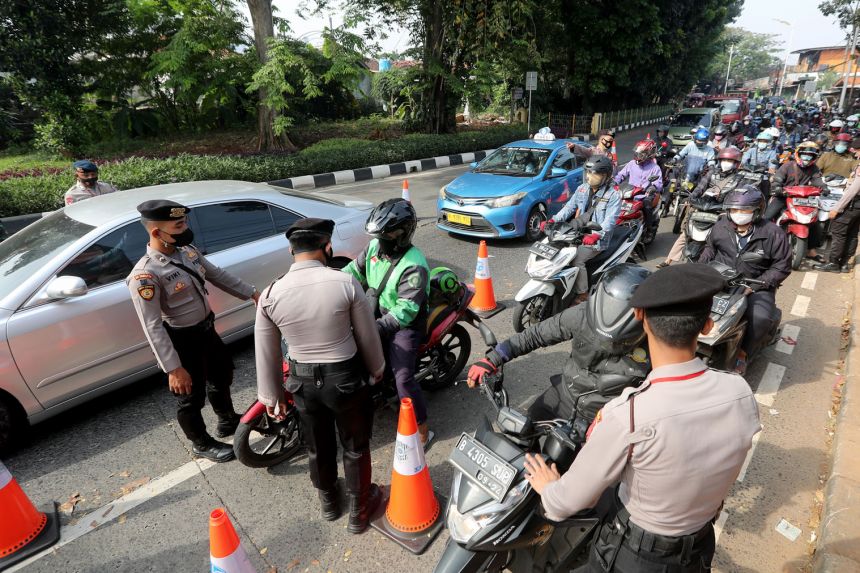 Indonesian police checking motorists to enforce Covid-19 emergency restrictions in the capital Jakarta on July 9, 2021.