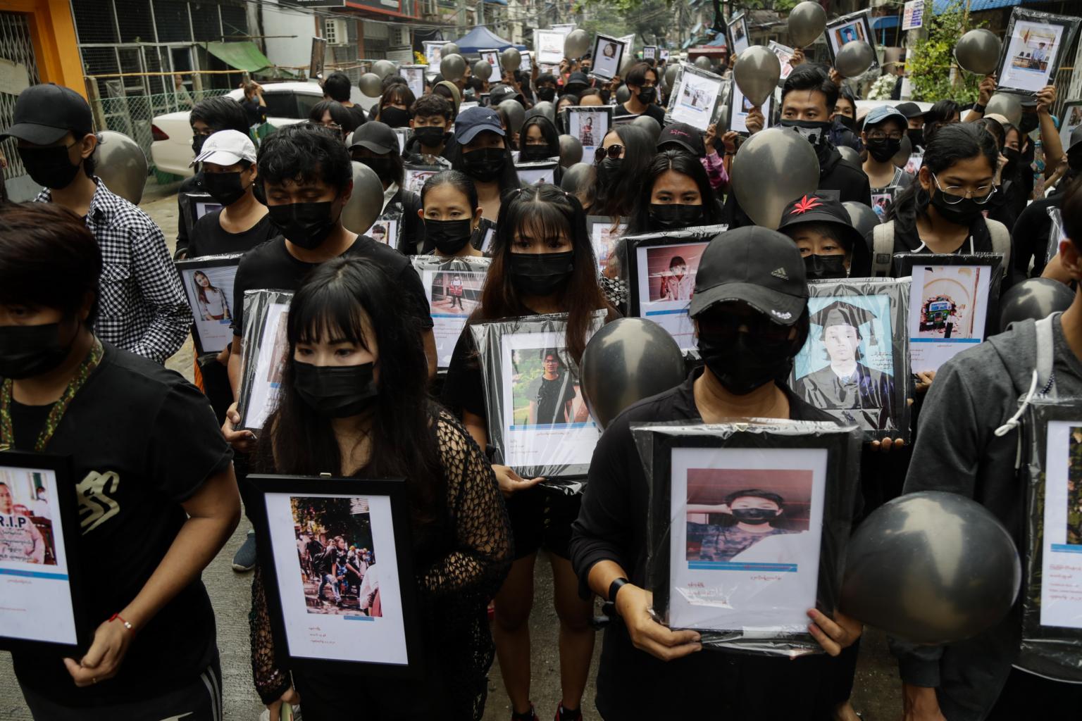 Demonstrators hold black balloons and pictures of victims who were shot dead by armed troops in Yangon on April 5, 2021.